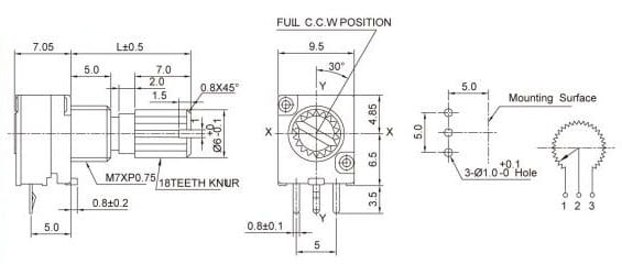 Potencjometr obrotowy osiowy o charakterystyce logarytmicznej z możliwością montażu na panel i do obwodu PCB.