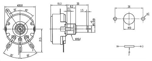 Potencjometr obrotowy osiowy o charakterystyce liniowej z możliwością montażu na panel.