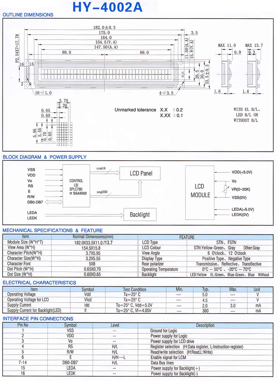 AC-4002A YIY Y/G E6 wyświetlacz alfanumeryczny LCD 40x2
