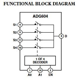 Układ AD604 to analogowy multipexer CMOC składający się z 4 pojedynczych kanałów. Układ umożliwia przełączenie jednego z czterech wejść.