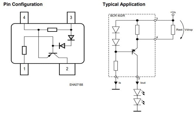 układ BCR402R dostarcza stabilny prąd polaryzacji dla diod elektroluminescencyjnych (LED).