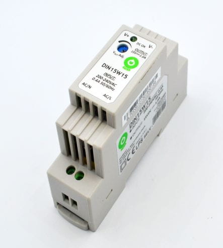 Zasilacz DIN15W15 przeznaczony jest do pracy w systemach oświetleniowych, elektroniki przemysłowej. Wyposażony jest w układy zabezpieczające zapewniające bezawaryjna pracę, jak również w uchwyt do montażu na szynę DIN
