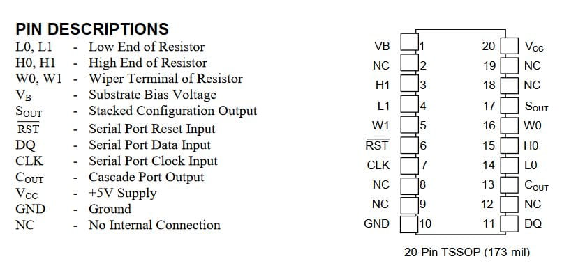 Układ DS1267BE-10 to zespół dwóch sterowanych cyfrowo potencjometrów o rezystancji 10K każdy przełączanych w 256 krokach. Wyjście typu SPI umożliwia na precyzyjny odczyt z obu potencjometrów.