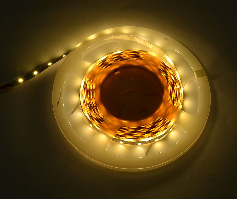 Jednokolorowa taśma LED, kolor świecenia biały ciepły i jasności świecenia ma 1m wynoszącym 6W. Możliwość cięcia taśmy w wyznaczonym miejscu co 5cm.