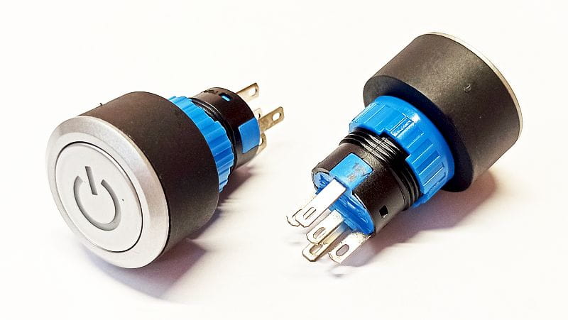 Przycisk chwilowy podświetlany; kolor zielony; oznaczenie POWER