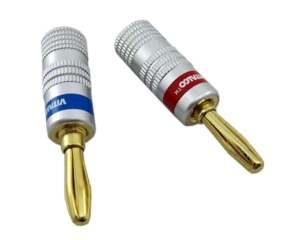 Wtyk bananowy metalowy z możliwością przykręcenia przewodu.