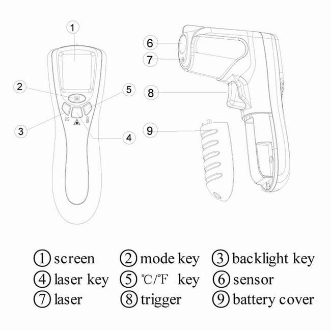 zasilanie: 9V zakres temperatury: -20°C / 300°C klasa lasera: 2 długośc fali: 630-670nm czas odpowiedzi: < 1 sekundy