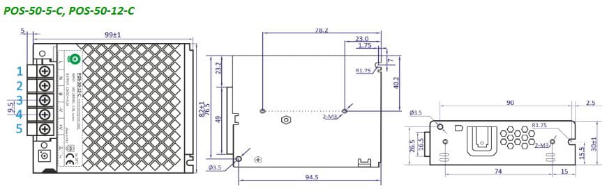 Zasilacz POS-50-5-C w obudowie metalowej, przeznaczony jest do pracy w systemach oświetleniowych, elektroniki przemysłowej. Wyposażony jest w układy zabezpieczające zapewniające bezawaryjna pracę.