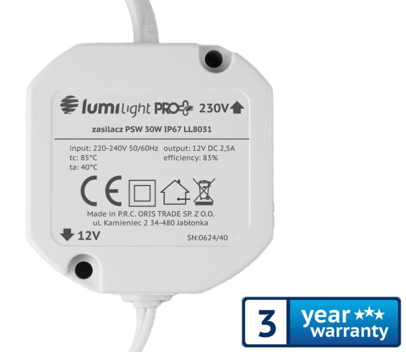 PSW30W zasilacz impulsowy dopuszkowy 12V / 2,5A / 30W, IP67