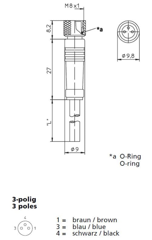 Złącze przemysłowe RKMV 3-224/2M, 3 pin żeńskiej. Wykorzystywane w automatyce podłączenia czujników zbliżeniowych, optycznych. Złącze RKMV 3-225/2M zakończone jest przewodem o długości 2m.