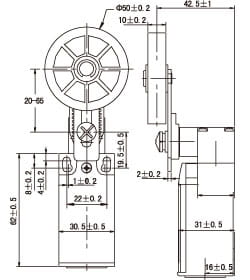 Przełącznik krańcowy z dźwignią zakończony z rolką gumową o średnicy 50mm. Styki NO + NC zakończone dławnicą PG13,5