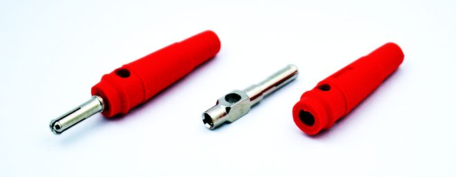 Wtyk bananowy w osłonie gumowej, kolor czerwony